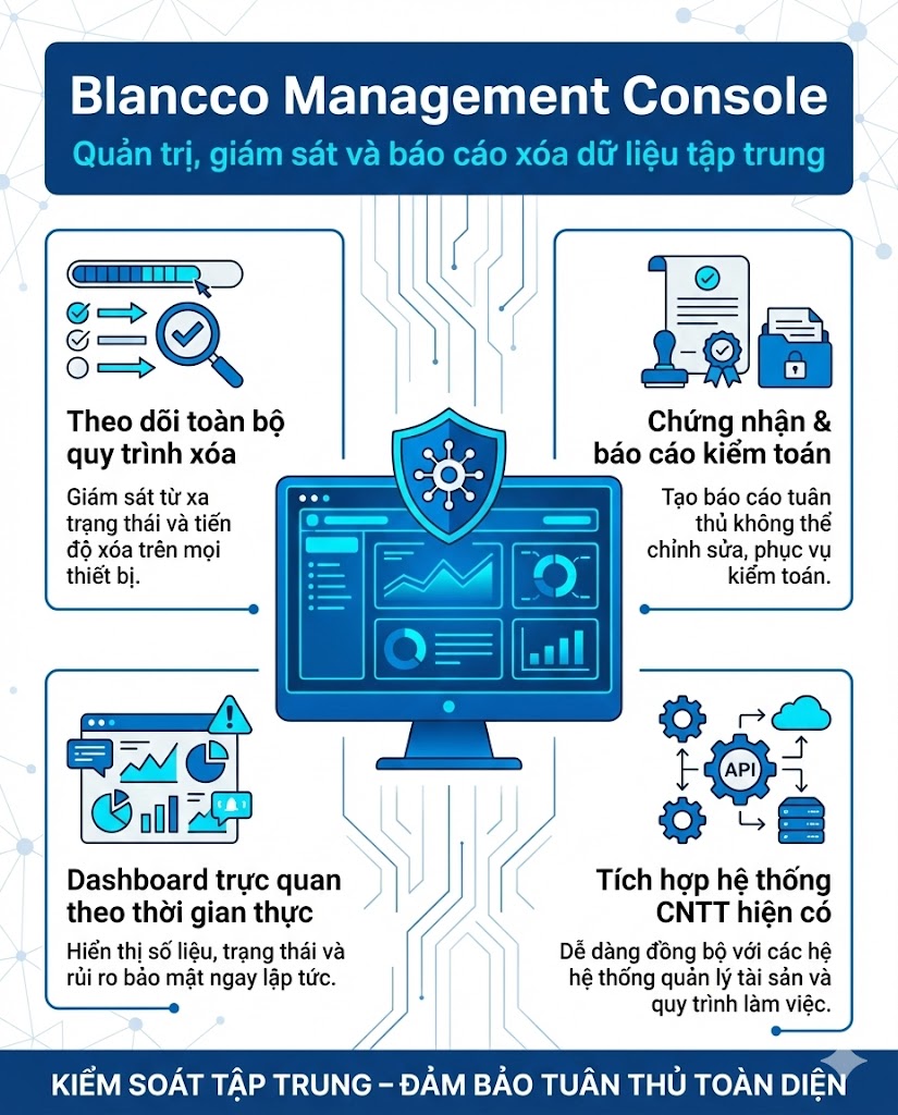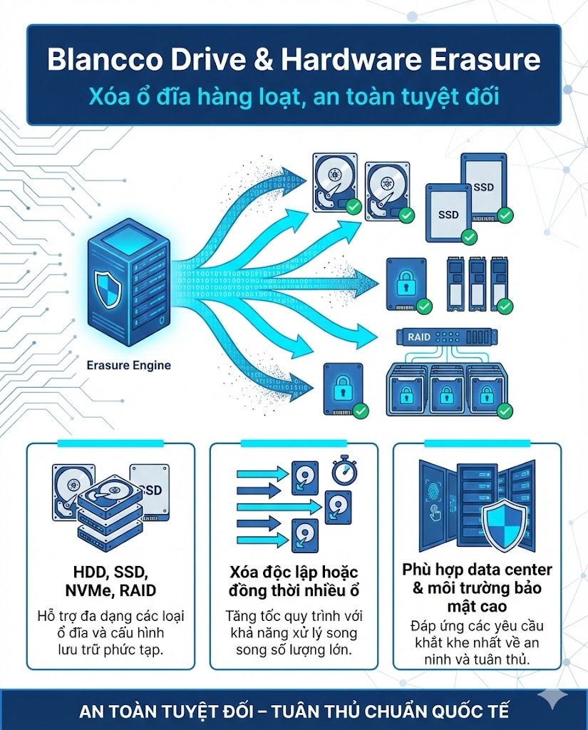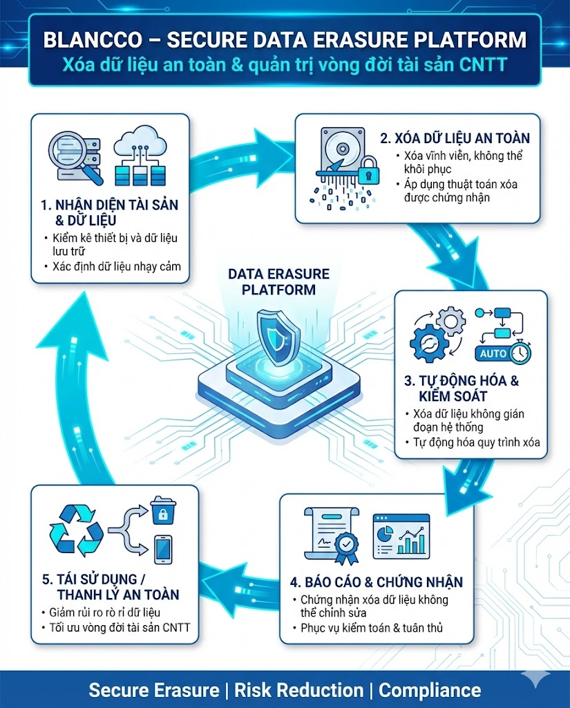 Blancco Data Erasure là giải pháp xóa dữ liệu an toàn và vĩnh viễn, giúp doanh nghiệp kiểm soát rủi ro bảo mật trong toàn bộ vòng đời tài sản CNTT – từ tái sử dụng, chuyển giao đến thanh lý thiết bị.