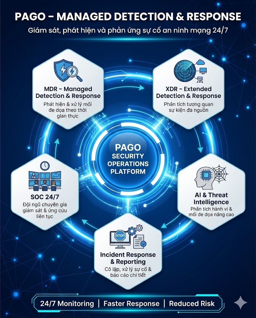 PAGO là nhà cung cấp dịch vụ an ninh mạng quản lý (Managed Security Services) với trọng tâm là MDR – Managed Detection and Response, kết hợp nền tảng công nghệ AI và đội ngũ chuyên gia bảo mật 24/7.