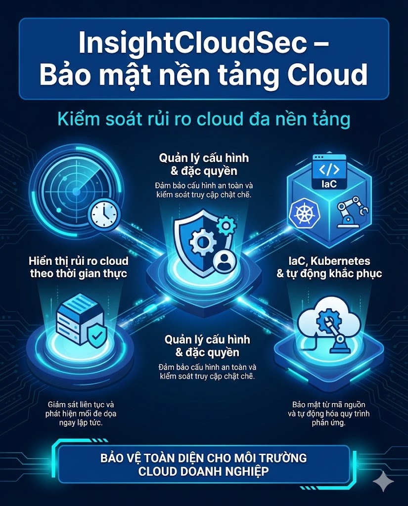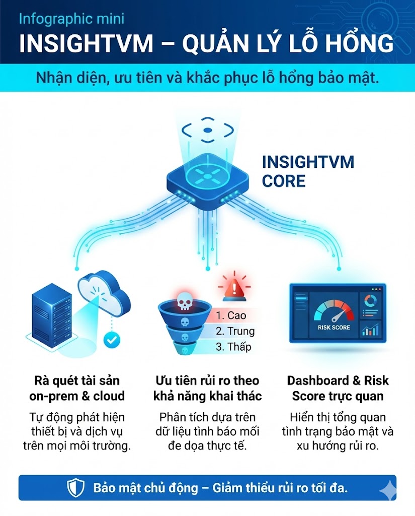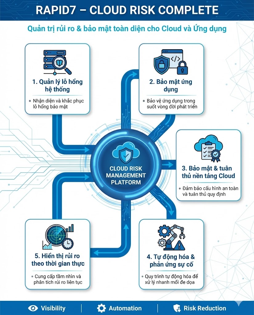 Rapid7 Cloud Risk Complete (CRC) là gói giải pháp bảo mật hợp nhất dành cho môi trường Cloud – Hybrid – Application, giúp tổ chức nhận diện rủi ro, quản lý lỗ hổng, bảo vệ ứng dụng, kiểm soát cấu hình cloud và tự động hóa phản ứng bảo mật trên một nền tảng duy nhất.